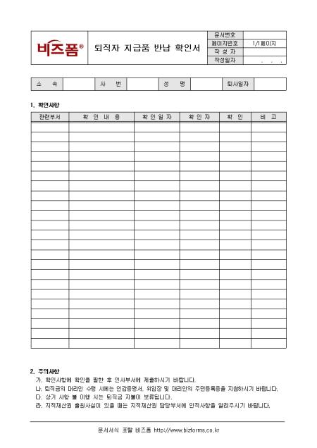 퇴직자 지급품 반납에 관한 사항을 기록/ 관리할 수 있는 퇴직자 지금품 반납 확인서입니다. 소속, 사번, 성명, 퇴사일자, 확인사항 등의 항목으로 구성되어있습니다.