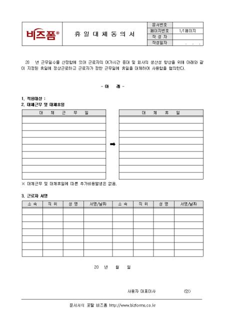 근로자의 여가시간 증대 및 회사의 생산성 향상을 위해지정된 휴일에 정상근로하고 근로자가 정한 근무일에 휴일을 대체하여 사용함을 협의한다는 내용의 휴일대체동의서입니다. 적용대상, 대체근무 및 대체휴일, 근로자 서명 등의 항목으로 구성되어있습니다.