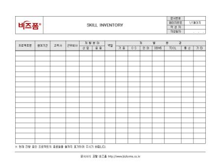 IT 스킬에 관한 현황을 기록/ 관리할 수 있는 IT스킬현황표(SKILL INVENTORY)입니다. 프로젝트명, 참여기간, 근무회사, 개발분야, 개발환경 등의 항목으로 구성되어있습니다.