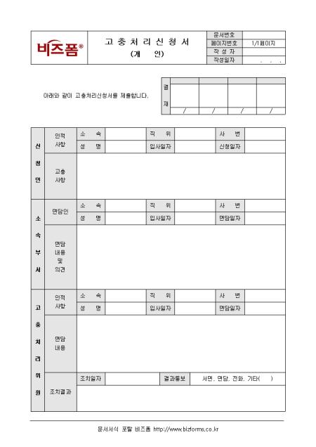 사원 개인이 고충처리를 신청할 때 사용할 수 있는 고충처리신청서입니다. 신청인, 고충사항, 면담인, 면담내용 및 의견, 조치결과 등의 항목으로 구성되어있습니다.