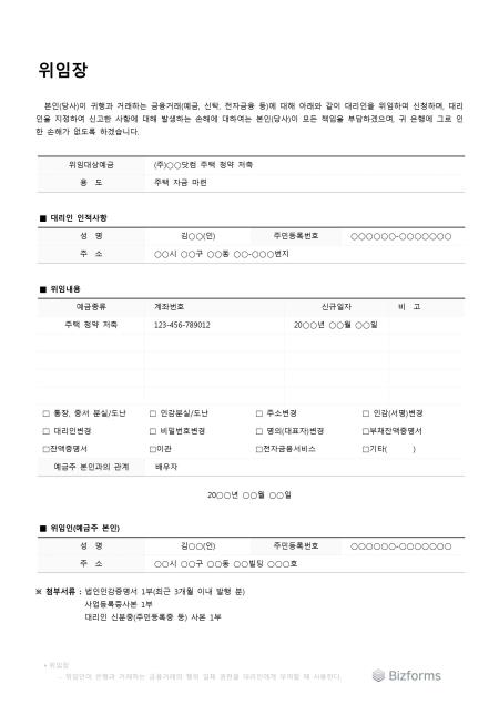 은행과 거래하는 금융거래에 대해 대리인을 위임하여 신청한다는 내용의 표준 금융 위임장입니다. 대리인, 위임인의 인적사항, 위임내용 등의 항목으로 구성되어있습니다.