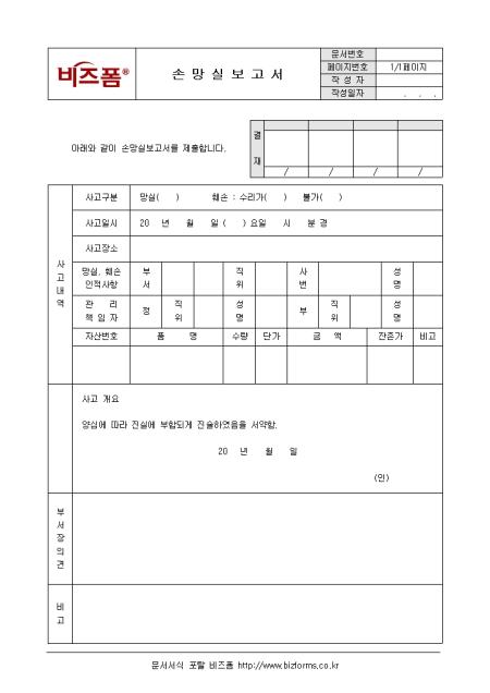 비품의 손망실에 관한 사항을 보고하는 손망실보고서입니다. 사고내역, 부서장의견, 비고 등의 항목으로 구성되어있으며 비품의 망실, 훼손 시 사용자는 그 경유를 12시간 내 관리책임자에게 손망실보고서를 작성하여 보고합니다.
