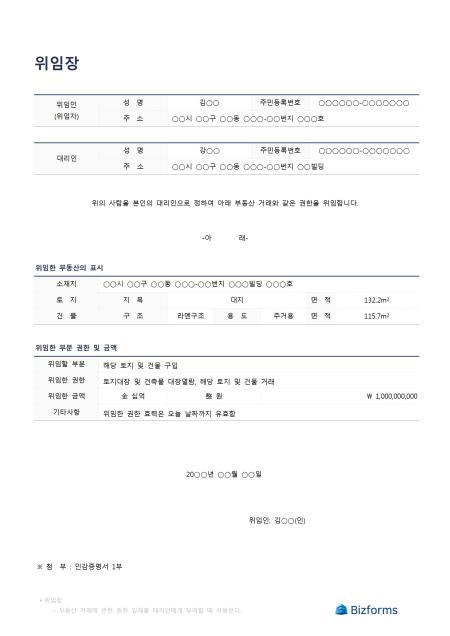 부동산매매, 부동산임대차, 전세, 월세 등의 부동산 거래에 관한 권한 일체를 대리인에게 부여한다는 내용의 표준 부동산 위임장입니다. 위임인, 대리인의 인적사항, 부동산의 표시 등의 항목으로 구성되어있습니다.