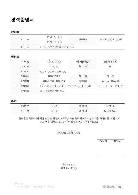 표준 양식에 따라 정확한 정보로 경력증명서 작성 완료