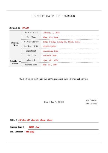 근무한 회사에서 본인이 재직한 기간을 증명할 때 사용 하는 표준 영문 경력증명서로서, 이직 또는 근무한 경력을 증빙할 경우에 사용합니다. 인적사항, 경력사항, 발급처 등의 항목으로 구성되어있습니다.