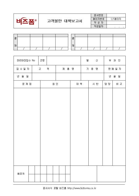 고객 불만에 대한 대책을 보고하는 고객불만 대책보고서입니다. 고객, 제품명, 문제점, 원인, 대책 등의 항목으로 구성되어있으며 품질관리부서에서 작성 사용합니다.