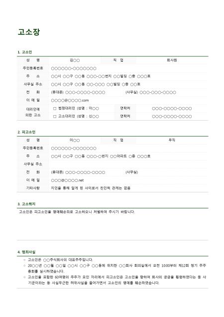 대검찰청 표준 고소장 양식에 맞춰 작성된 명예훼손 고소장입니다. 고소인, 피고소인, 고소취지, 범죄사실 등의 항목으로 구성되어있으며, 작성법 등이 포함되어있습니다.