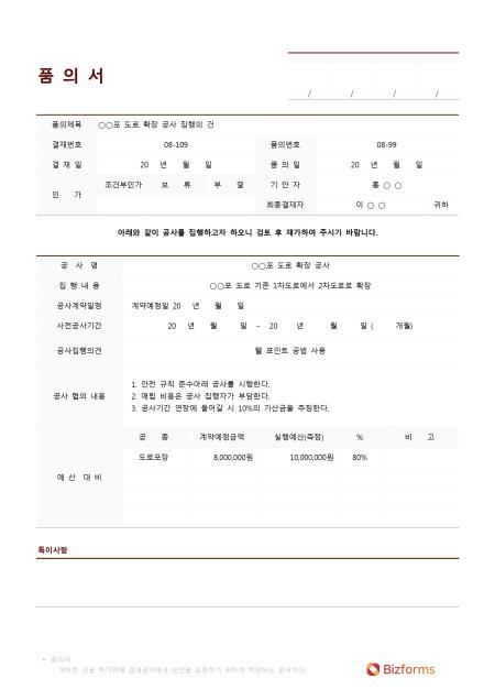 공사 집행 등을 품의하고자 할 때 사용할 수 있는 표준 공사 품의서입니다. 품의제목, 결재번호, 결재일, 인가, 품의일 등의 항목으로 구성되어있습니다.