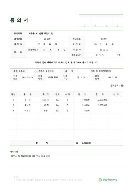 물품 등의 구입, 구매를 품의하고자 할 때 사용할 수 있는 표준 구매 품의서입니다. 품의제목, 결재번호, 결재일, 인가, 품의일 등의 항목으로 구성되어있습니다.