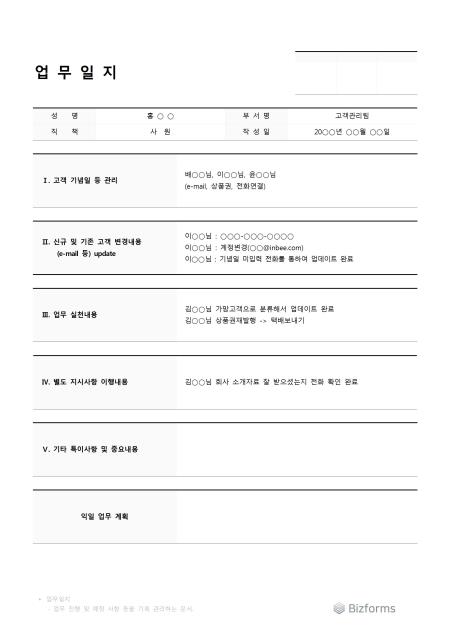 고객관리직 분야에서 사용 및 활용할 수 있는 표준 고객관리 업무일지입니다. 담당자의 인적사항, 고객 기념일 등 관리, 고객 변경 내용 등의 항목으로 구성되어있습니다.