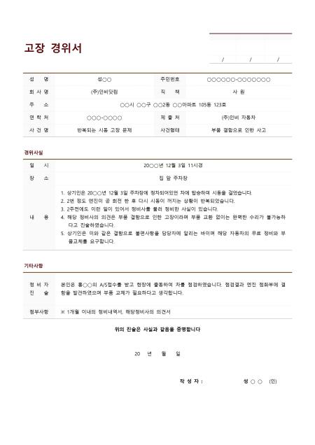 자동차 고장에 대한 사건경위를 설명하는 사례 샘플이 작성되어있는 표준 고장 경위서 입니다. 경위서 작성자의 인적사항, 경위사실, 기타사항 항목으로 구성되어 있습니다.