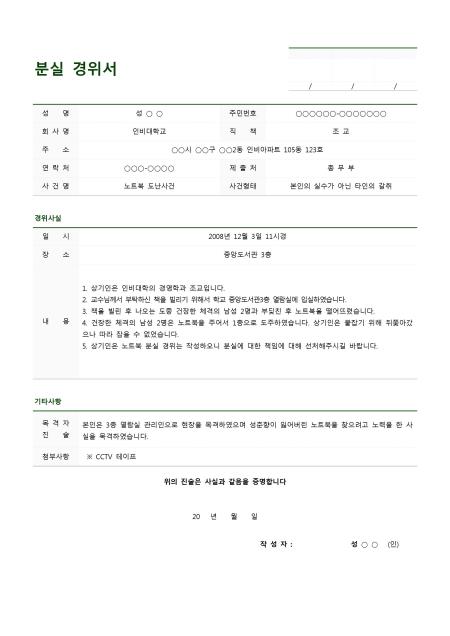 물품 도난(분실)에 관한 경위서 샘플이 작성되어 있는 표준 분실 경위서 입니다. 경위서 작성자의 인적사항, 경위사실, 기타사항 항목으로 구성되어 있습니다.