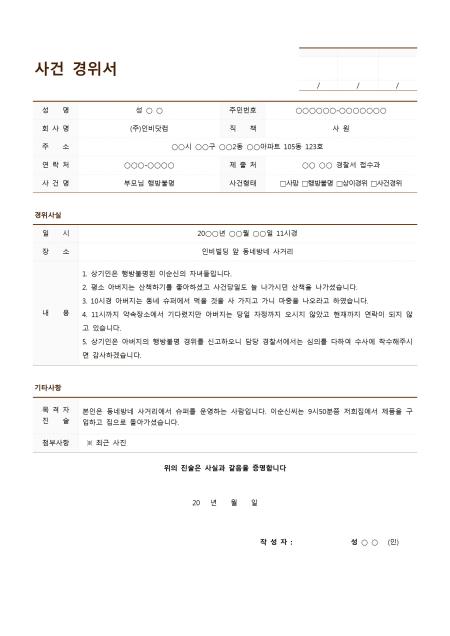 행방불명 사건에 관한 경위 사례가 작성되어 있는 표준 사건 경위서 입니다. 경위서 작성자의 인적사항, 경위사실, 기타사항 항목으로 구성되어 있습니다.