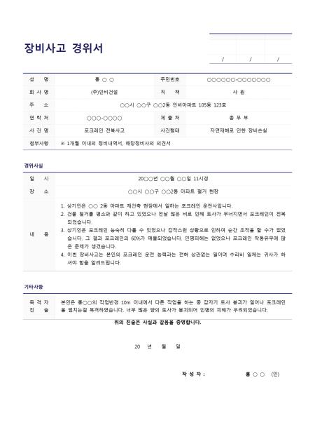 포크레인 장비 손상에 따른 사건 경위를 작성한 사례가 작성되어 있는 표준 장비사고 경위서 입니다. 경위서 작성자의 인적사항, 경위사실, 기타사항 항목으로 구성되어 있습니다.