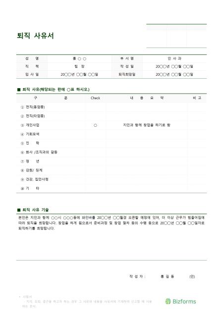 회사의 퇴직, 퇴사 시 그 사유를 기록/ 보고할 수 있는 표준 퇴직(퇴사) 사유서입니다. 인적사항, 퇴직사유 선택란, 퇴직사유 기술 등의 항목으로 구성되어있습니다.