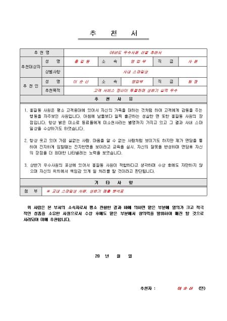 포상 추천에 관한 내용 샘플이 작성되어 있는 표준 포상 추천서 입니다. 추천명, 추천대상자, 추천인, 추천사유, 기타사항 항목으로 구성되어 있습니다.