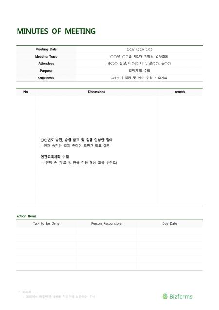 영문으로 구성되어있는 표준 영문 회의록입니다. Meeting Date , Meeting Topic, Attendees, Purpose 등의 항목으로 구성되어있습니다.