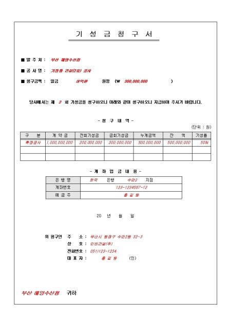 기성금을 청구할 때 사용할 수 있는 표준 기성금 청구서입니다. 발주처, 공사명, 청구금액, 계좌입금내용 등의 항목으로 구성되어있습니다.