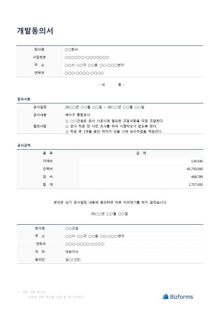 공사일정과 내용에 동의할때 사용되는 표준 개발 동의서 입니다. 신상정보, 동의내용 항목으로 구성되어 있습니다.