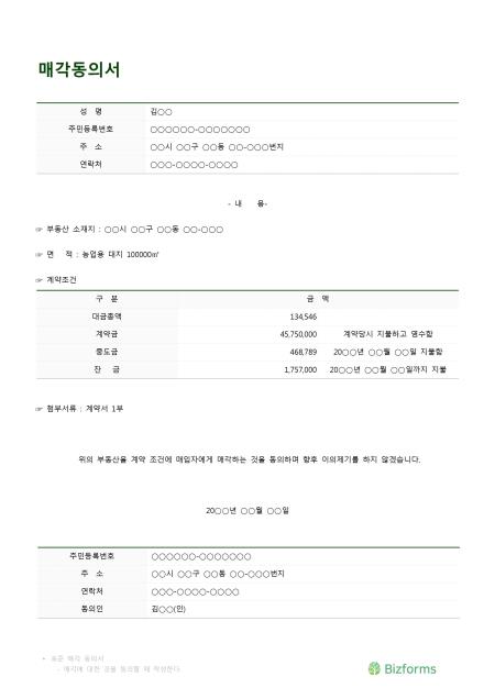 매입자에게 계약조건에 매각 하는것을 동의할때 사용하는 표준 매각 동의서 입니다. 신상정보, 매각내용 항목으로 구성되어 있습니다.
