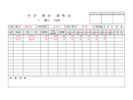 한 주간의 제품 생산 내역을 계획/ 보고할 때 사용할 수 있는 주간 표준 생산 계획표입니다. 순위, 모델, 품명, 발주량 등의 항목으로 구성되어있습니다.