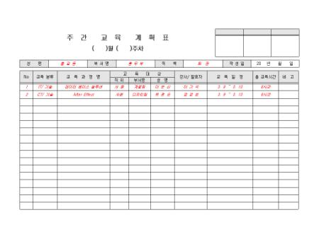 한 주간의 교육계획을 기록/ 보고할 수 있는 표준 주간 교육 계획표입니다. 교육분류, 교육과정명, 교육대상 등의 항목으로 구성되어있습니다.