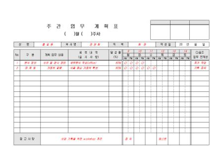 한 주간의 개인 업무 계획을 기록/ 보고할 때 사용할 수 있는 표준 주간 업무 계획표입니다. 구분, 계획 업무 내용, 세부내역, 달성율 등의 항목으로 구성되어있습니다.