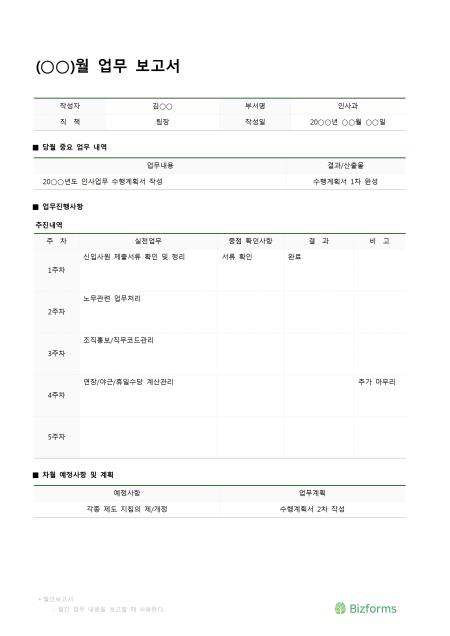 한달간의 업무활동내용을 기록/ 보고할 때 사용할 수 있는 표준 월간 업무보고서입니다. 당월 중요 업무 내역, 업무진행사항 등의 항목으로 구성되어있습니다.