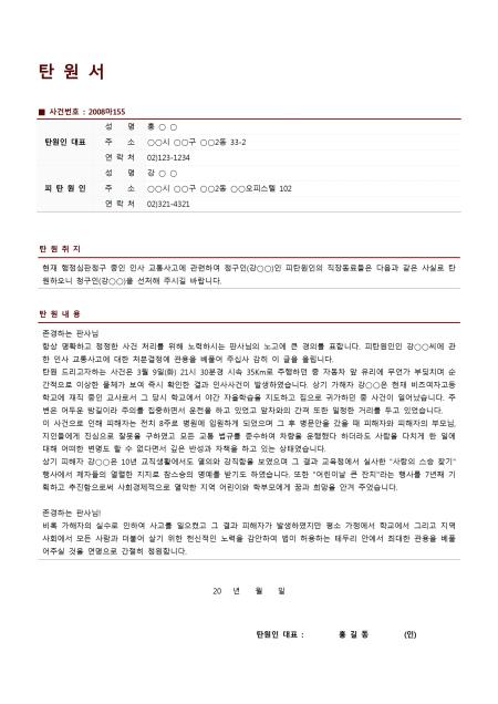 교통사고를 일으킨 직장동료를 선처해줄 것을 요청하는 내용의 표준 교통사고 탄원서입니다. 탄원인 대표, 피탄원인, 탄원취지 등의 항목으로 구성되어있습니다.