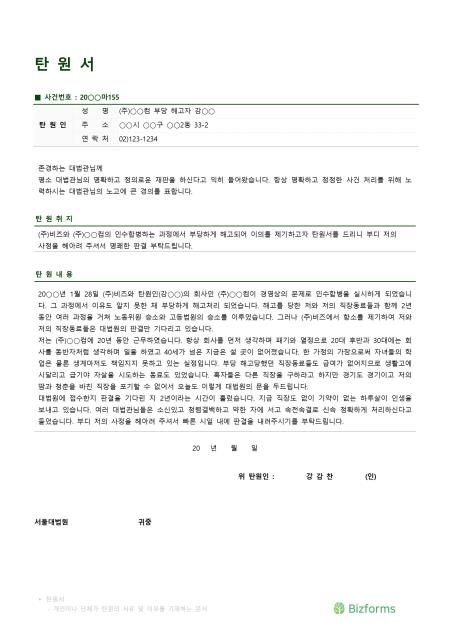 인수합병 과정에서 부당하게 해고를 당한 근로자가 이의를 제기하는 내용의 표준 부당해고 탄원서입니다. 사건번호, 탄원인, 탄원내용 등의 항목으로 구성되어있습니다.