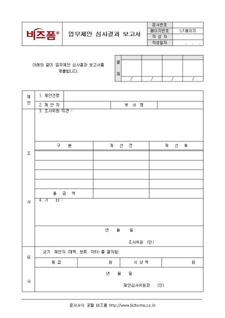 업무 제안의 심사결과를 보고하는 업무제안 심사결과 보고서입니다. 제안, 조사, 심사 등의 항목으로 구성되어있으며 작성 후 사장이 결재를 받아야 합니다.