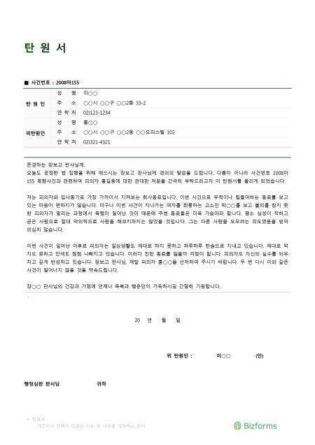 탄원인과 피탄원인의 성명, 주소, 연락처 등 인적사항과 사건번호, 관계를 명확히 기재합니다.