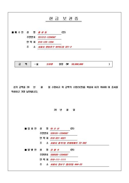 현금의 보관을 서류로 증명하기위해 사용되는 표준 현금 보관증 입니다. 매수인, 금액, 내용, 입회인, 발행인 항목으로 구성되어 있습니다.