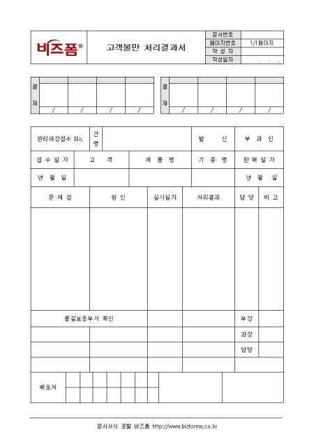 고객 불만에 대한 처리 결과를 보고하는 고객불만 처리결과서입니다. 고객, 제품명, 문제점, 원인, 처리결과 등의 항목으로 구성되어있으며 품질관리부서에서 조치 결과를 작성 보고합니다.
