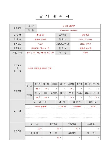 한 학기 동안의 강의계획을 수립/ 기록할 수 있는 표준 강의계획서입니다. 교과목명, 교수명, 수강대상, 강의실, 강의개요 및 목표 등의 항목으로 구성되어있습니다.