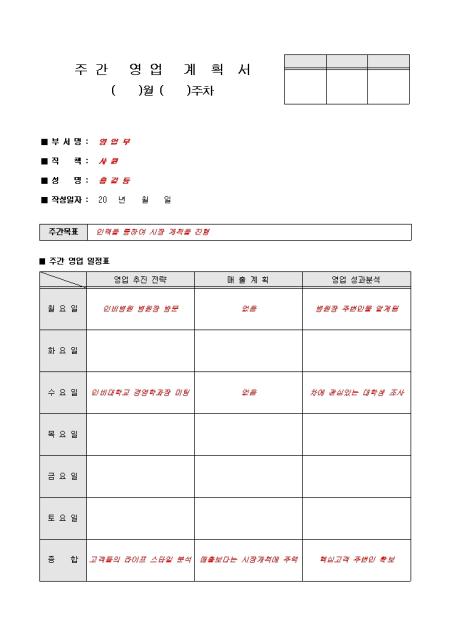 일정기간 동안 영업 계획을 주간별로 짜놓은 표준 주간 영업 계획서 입니다. 주간 목표, 주간 영업 일정표, 지출내역, 상세 영업이익, 개선사항, 항목으로 구성되어 있습니다.