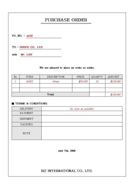 영문으로 작성되어있는 표준 영문 주문서입니다. No, ITEM, DESCRIPTION, PRICE 등의 항목으로 구성되어있습니다.