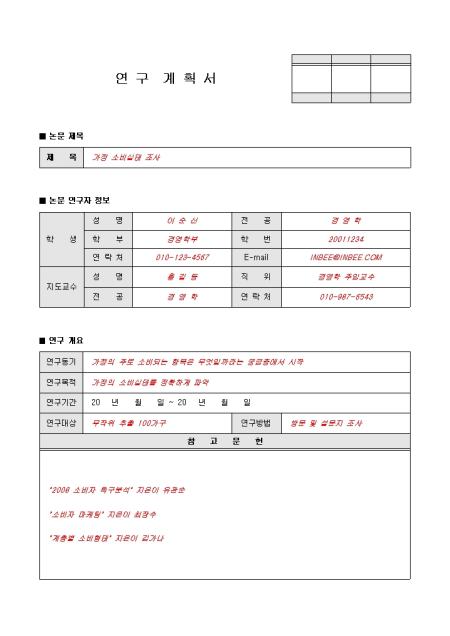 논문작성 기간동안 하여야할 계획을 짜놓은 표준 연구 계획서(논문)입니다. 논문제목, 논문 연구자 정보, 연구 개요, 연구결과, 실제 연구 결과 항목으로 구성되어 있습니다.