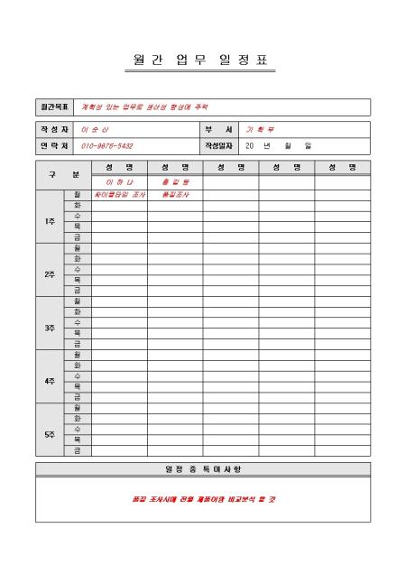 한달기간동안 하여야 할 업무를 날짜별로 짜 놓은 표준 월간 업무 일정표 입니다. 월간목표, 작성자 정보, 업무일정, 특이사항 항목으로 구성되어 있습니다.