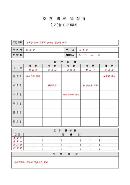 일주일동안 하여야 할 업무를 날짜별로 짜 놓은 표준 주간 업무 일정표 입니다. 주간 목표, 작성자 정보, 주간 업무 일정, 업무 진행율, 유의사항 항목으로 구성되어 있습니다.