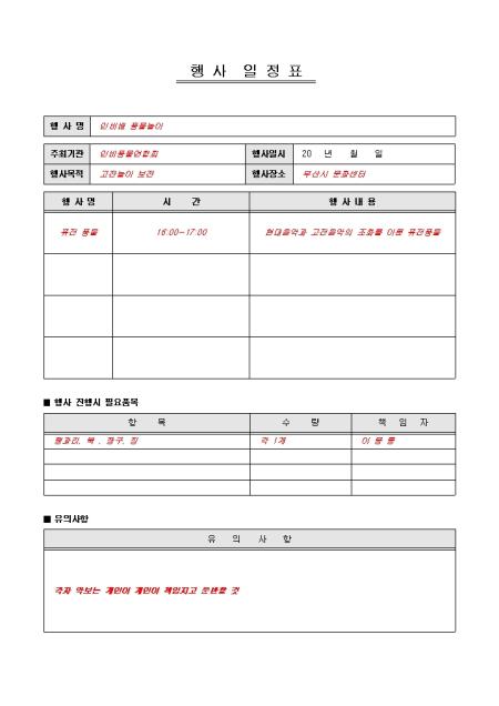 행사기간동안 하여야 할 계획을 날짜별로 짜 놓은 표준 행사 일정표 입니다. 행사명, 주최기관, 행사목적, 행사장소, 행사일정, 필요품목, 유의사항 항목으로 구성되어 있습니다.