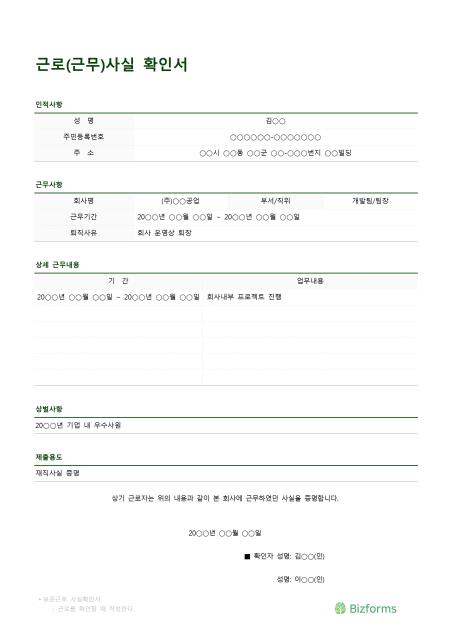 근무사실을 서류로 증명할때 사용되는 표준 근로(근무) 사실 확인서입니다. 인적사항, 근무사항, 근무내용 항목으로 작성되어 있습니다.