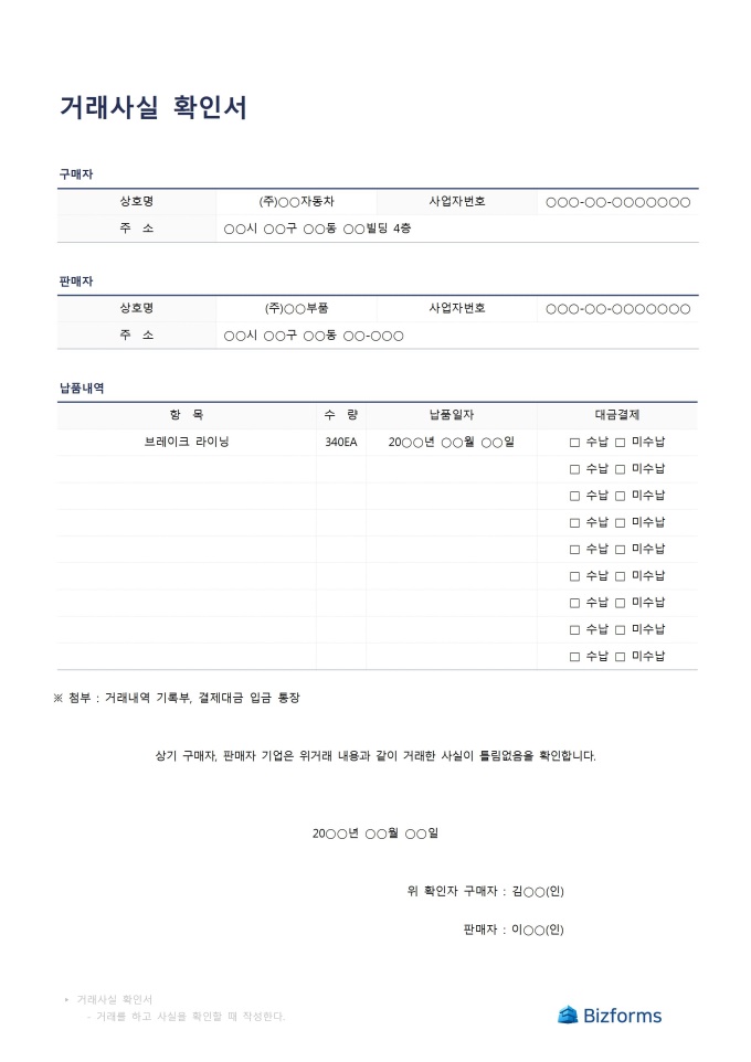 9,000원/월기업간에 납품 사실을 서류로 증명할때 사용되는 표준 납품 사실 확인서입니다. 구매자 정보, 판매자 정보, 납품내역 항목으로 구성되어 있습니다.