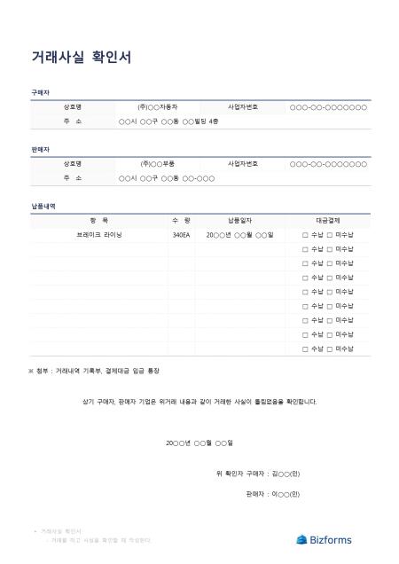 기업간에 납품 사실을 서류로 증명할때 사용되는 표준 납품 사실 확인서입니다. 구매자 정보, 판매자 정보, 납품내역 항목으로 구성되어 있습니다.