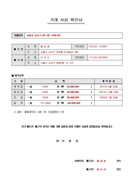 부동산 거래 사실을 서류로 증명할때 사용되는 표준 부동산 거래확인서입니다. 거래항목, 매도인, 매수인, 계약금액 항목으로 구성되어 있습니다.