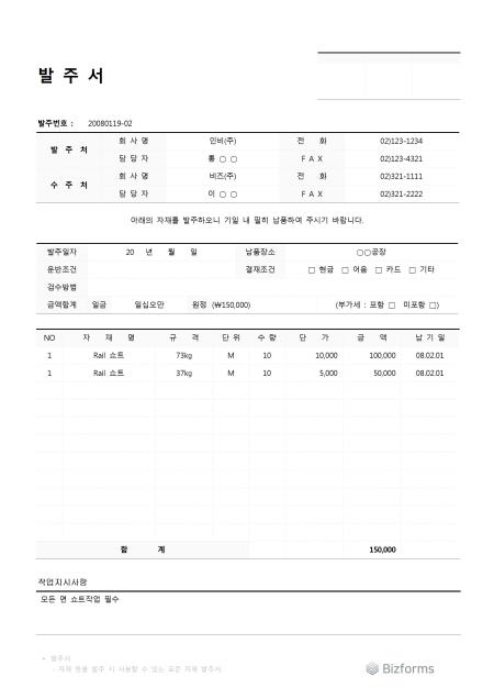 자재 등을 발주 시 사용할 수 있는 표준 자재 발주서입니다. 발주처, 수주처, 발주일자, 운반조건, 검수방법 등의 항목으로 구성되어있습니다.