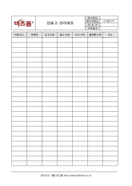 제품의 입고 또는 출고시 제품의 수량등을 기록할 수 있는 서식으로써 제품의 입고와 출고시 수량 불량품, 금액등을 기록할 수 있도록 구성되어 있습니다.