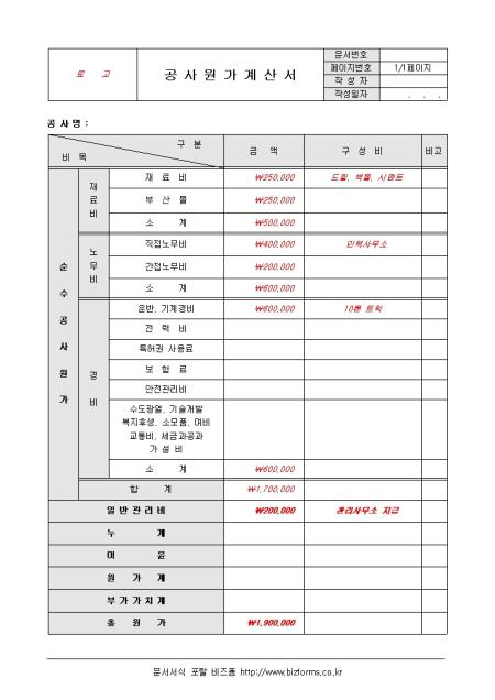 공사진행시 발생하는 비용등을 계산하여 원가계산할때 사용되는 서식으로써 공사에 사용되는 재료비 노무비, 경비등을 상세하게 기록할 수 있도록 구성되어 있습니다.