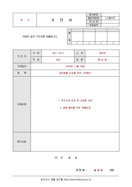 기안을 낼 때 사용하는 기안서로서 기안자의 인적사항과 기안일자, 제목, 상세내용, 특기사항 등으로 구성되어 있습니다.