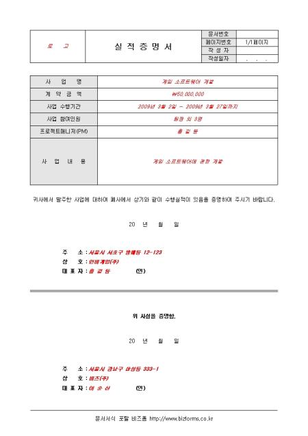 사업계획 실적을 분석하고자 할 때 사용하는 실적증명서로 사업명, 계약금액, 사업수행기간, 사업참여인원, 프로젝트매니저 등의 항목으로 구성되었습니다.